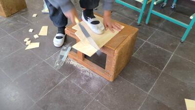 今日はまず、材料となる板をのこぎりでいろいろな形に切り分けました。