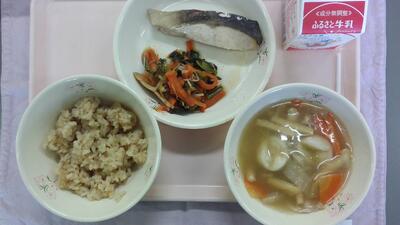 今日の献立は、茶飯、牛乳、すいとん、さけの塩焼き、小松菜の煮びたしです。