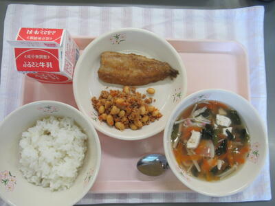 今日の献立は、大豆そぼろごはん、牛乳、すまし汁、いわしの蒲焼です。